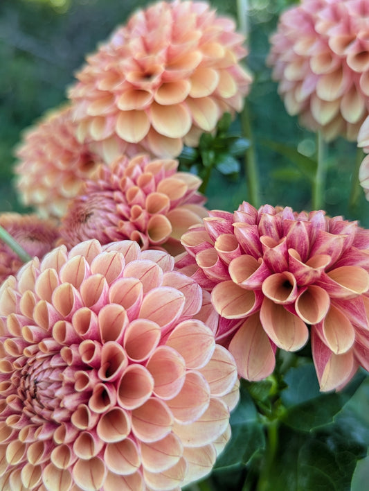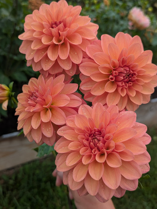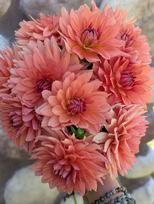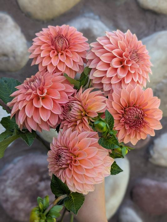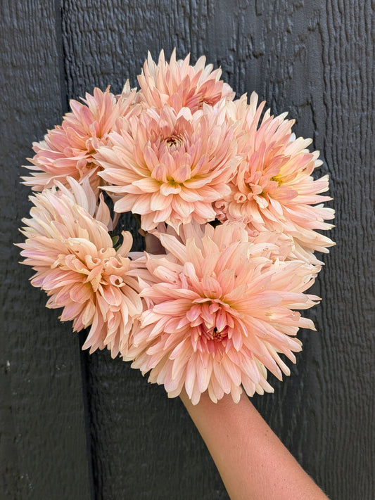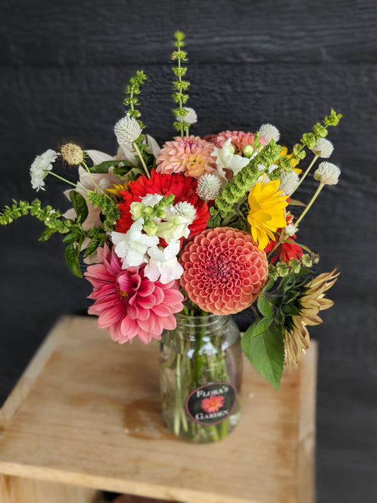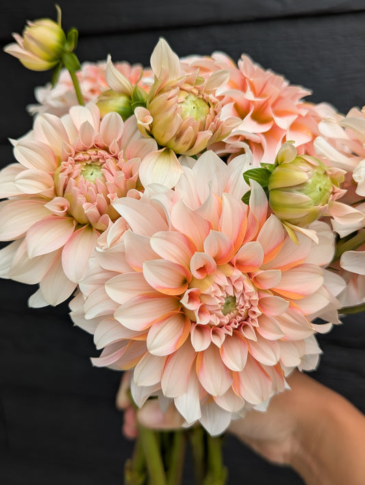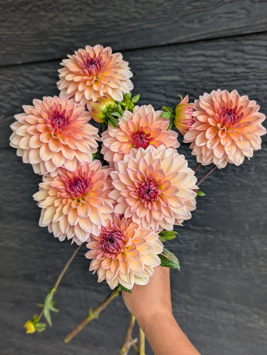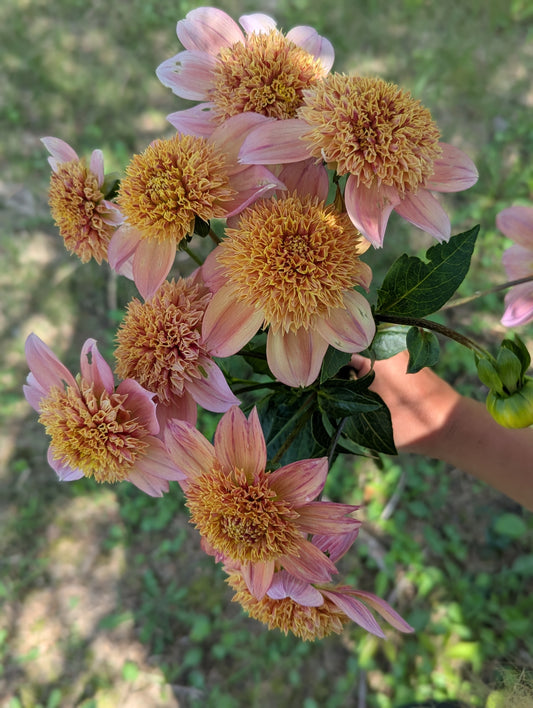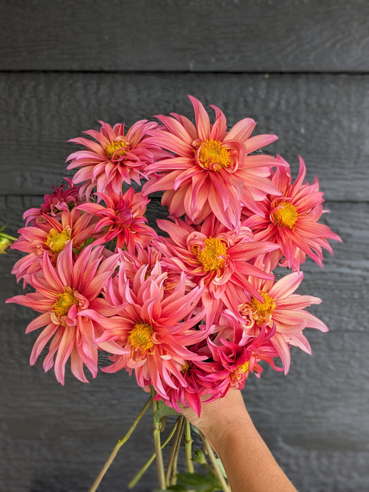 Welcome to Flora's Garden where our dahlias are an extension of the family. We give them so much love an care all year round. We grow our dahlias using organic methods. We use beneficial insects and organza bags to protect our petals from damage. Between our fertilizing, beneficial insects and a little prayer we did not even need to use organza bags for the entire second half of the growing season. We harvest the dahlias often always using a 10:1 water bleach solution, using this same practice between every clump when we divide. We take sanitizing seriously in our efforts to get the highest quality and healthiest tubers to our customers. We cull throughout the season any suspicious or stunted plants. Rest assured we only sell healthy looking and productive varieties. We prioritize dahlias that work best as cut flowers and are always fine tuning our catalog to include the best cut flower varieties as well as some fun unicorns. In 2025 we grew around 1,500-1,600 dahlias and had good tuber production. It should be a great sale!