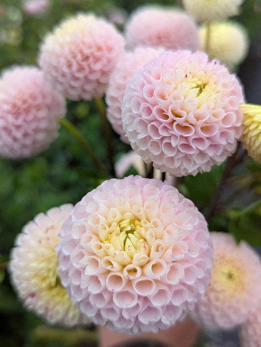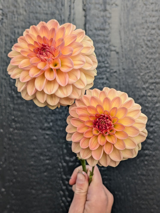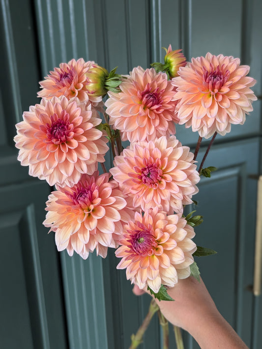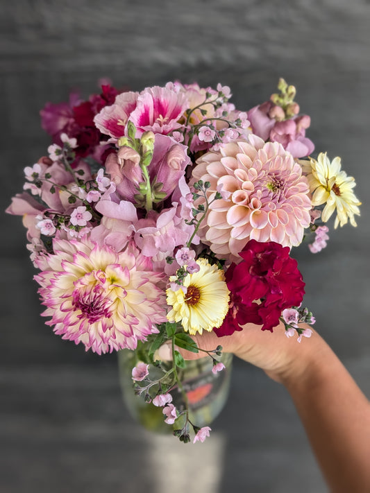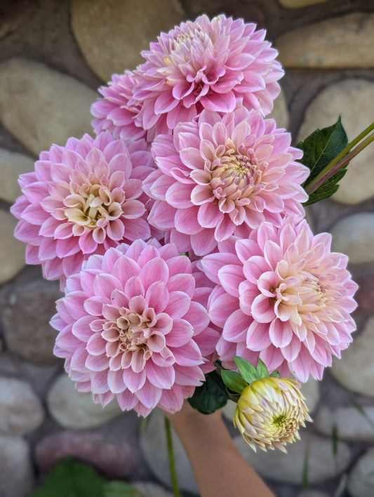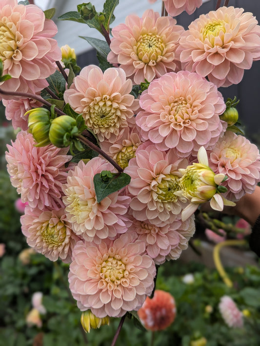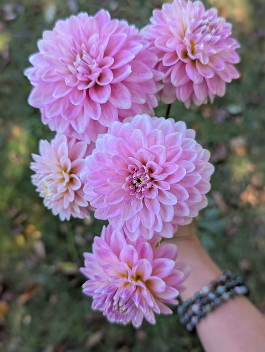 Welcome to Flora's Garden where our dahlias are an extension of the family. We give them so much love an care all year round. We grow our dahlias using organic methods. We use beneficial insects and organza bags to protect our petals from damage. Between our fertilizing, beneficial insects and a little prayer we did not even need to use organza bags for the entire second half of the growing season. We harvest the dahlias often always using a 10:1 water bleach solution, using this same practice between every clump when we divide. We take sanitizing seriously in our efforts to get the highest quality and healthiest tubers to our customers. We cull throughout the season any suspicious or stunted plants. Rest assured we only sell healthy looking and productive varieties. We prioritize dahlias that work best as cut flowers and are always fine tuning our catalog to include the best cut flower varieties as well as some fun unicorns. In 2025 we grew around 1,500-1,600 dahlias and had good tuber production. It should be a great sale!