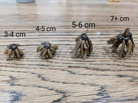 This year we sourced our ranunculus from our wholesaler at Ball Seed. We were given permission to use their photos for any new to us varieties we don't have photos for yet. For each variety we ordered the biggest corm size available. We've noticed the bigger the corm size the bigger the ranunculus and the more bloom per corm! All corms are size 5-6 cm and some are size 7+ (these are massive in the ranunculus corm world a produce amazing flowers). Below you can see what to expect with the different corm sizes