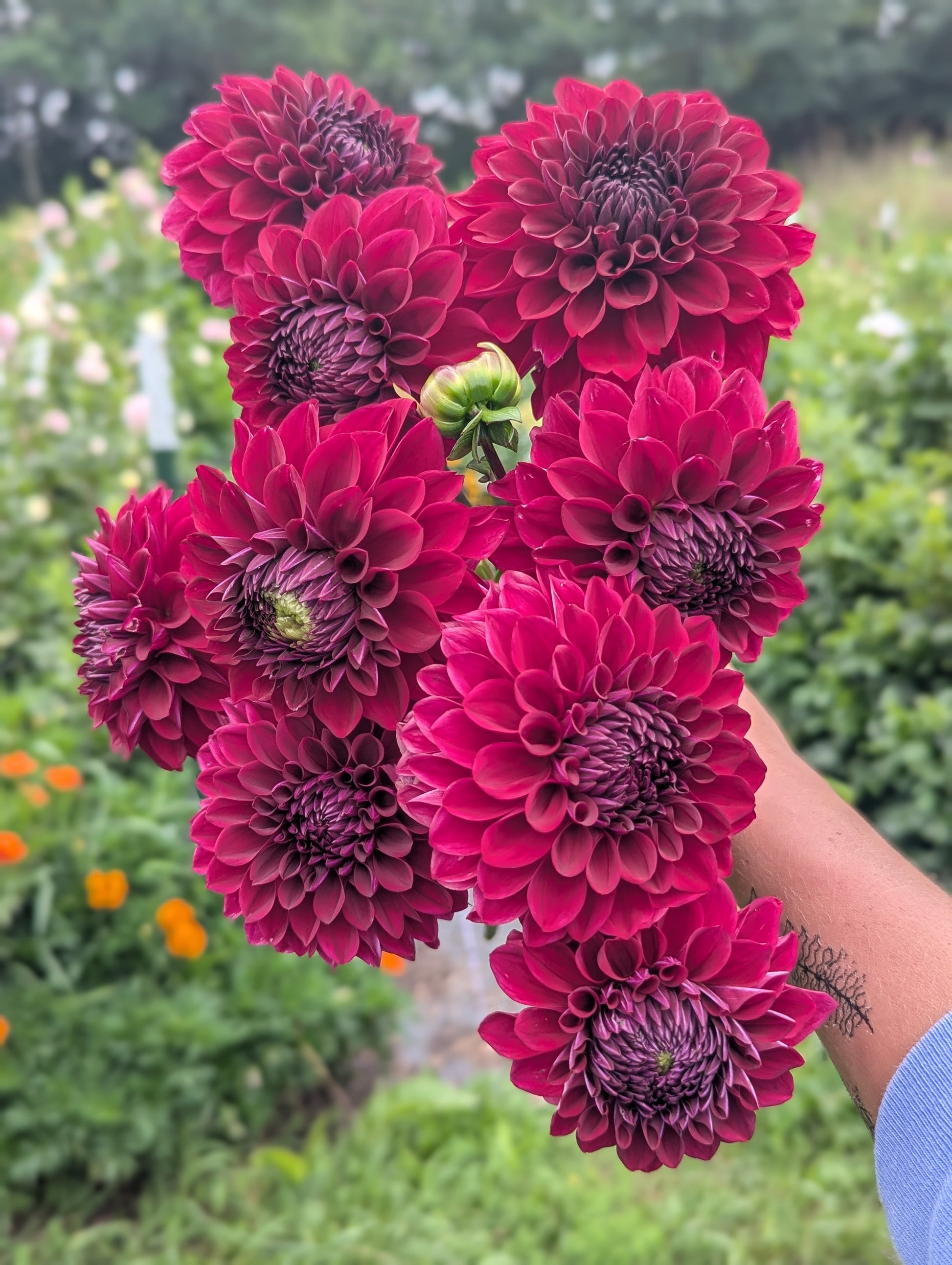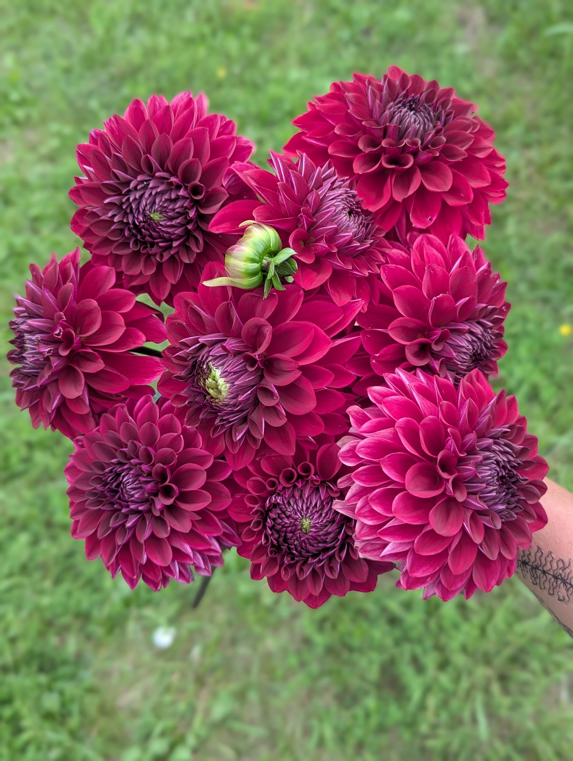 A bold red Formal Decorative dahlia. Beautiful dark foliage and stems. Long stems and lots of blooms! Blooms are about 4"