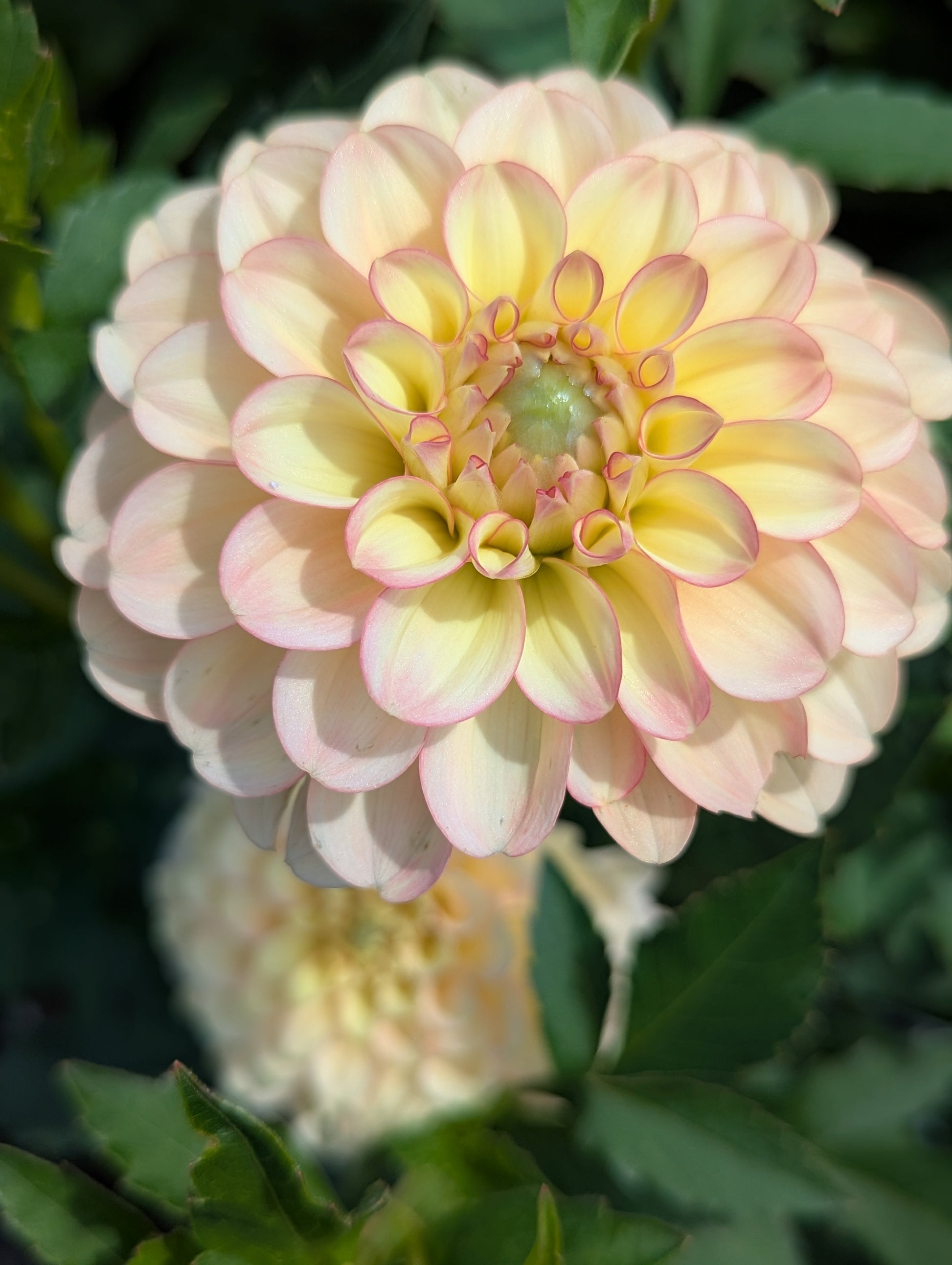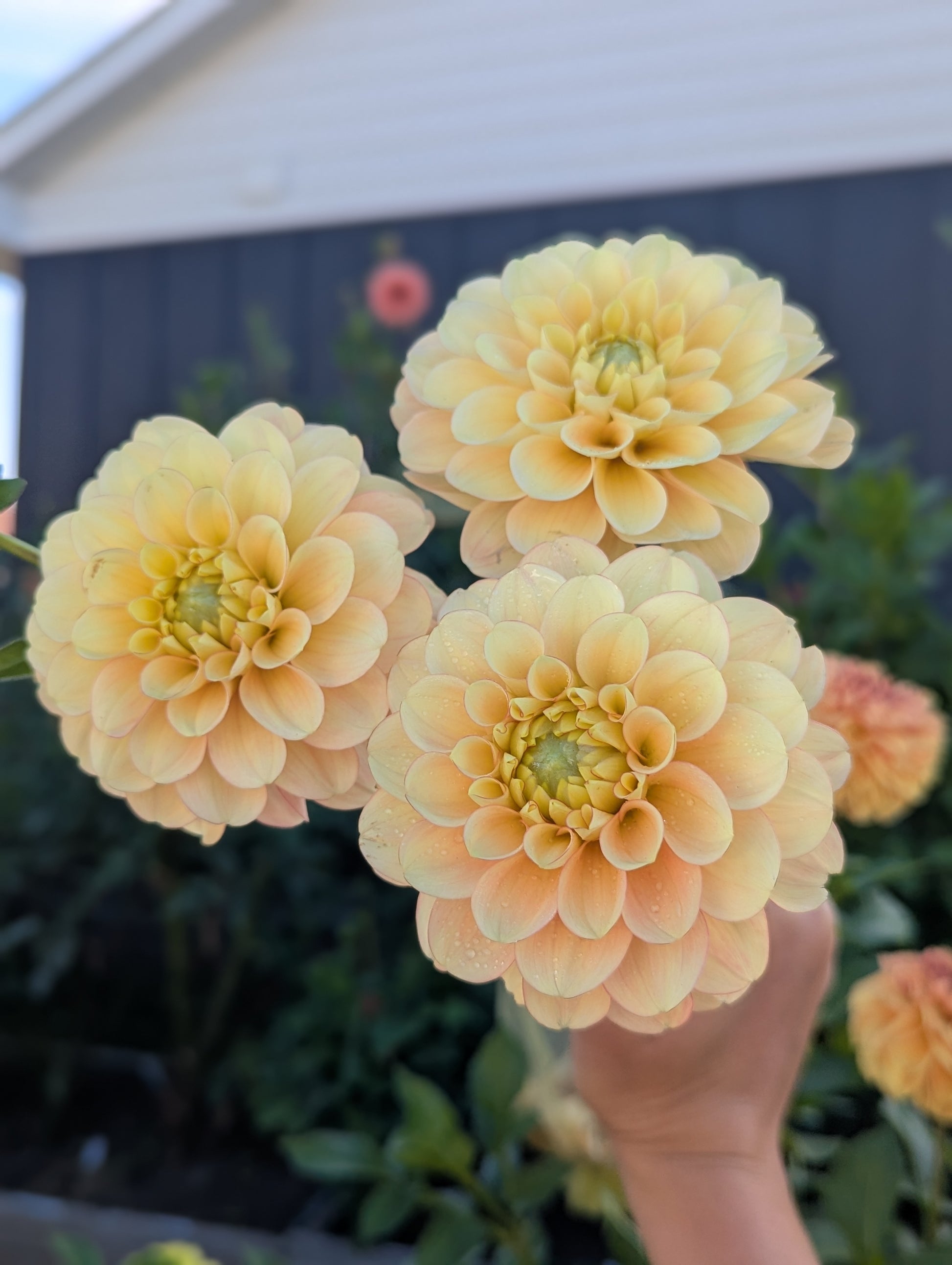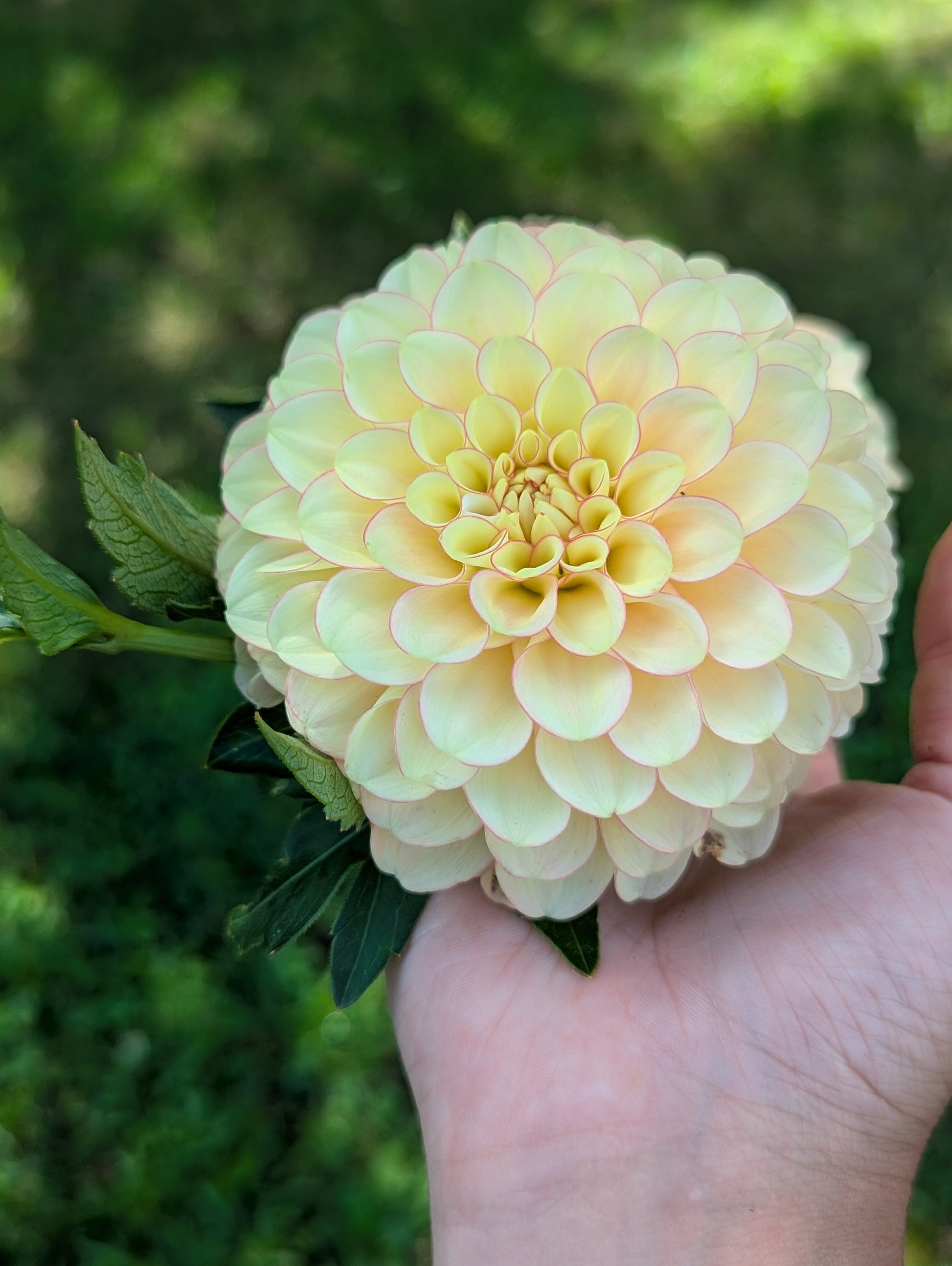 A beautiful creamy yellow with the most delicate raspberry picotee edge. The plant is super productive and blooms on shorter stems in clusters. Blooms are about 3.5" across.