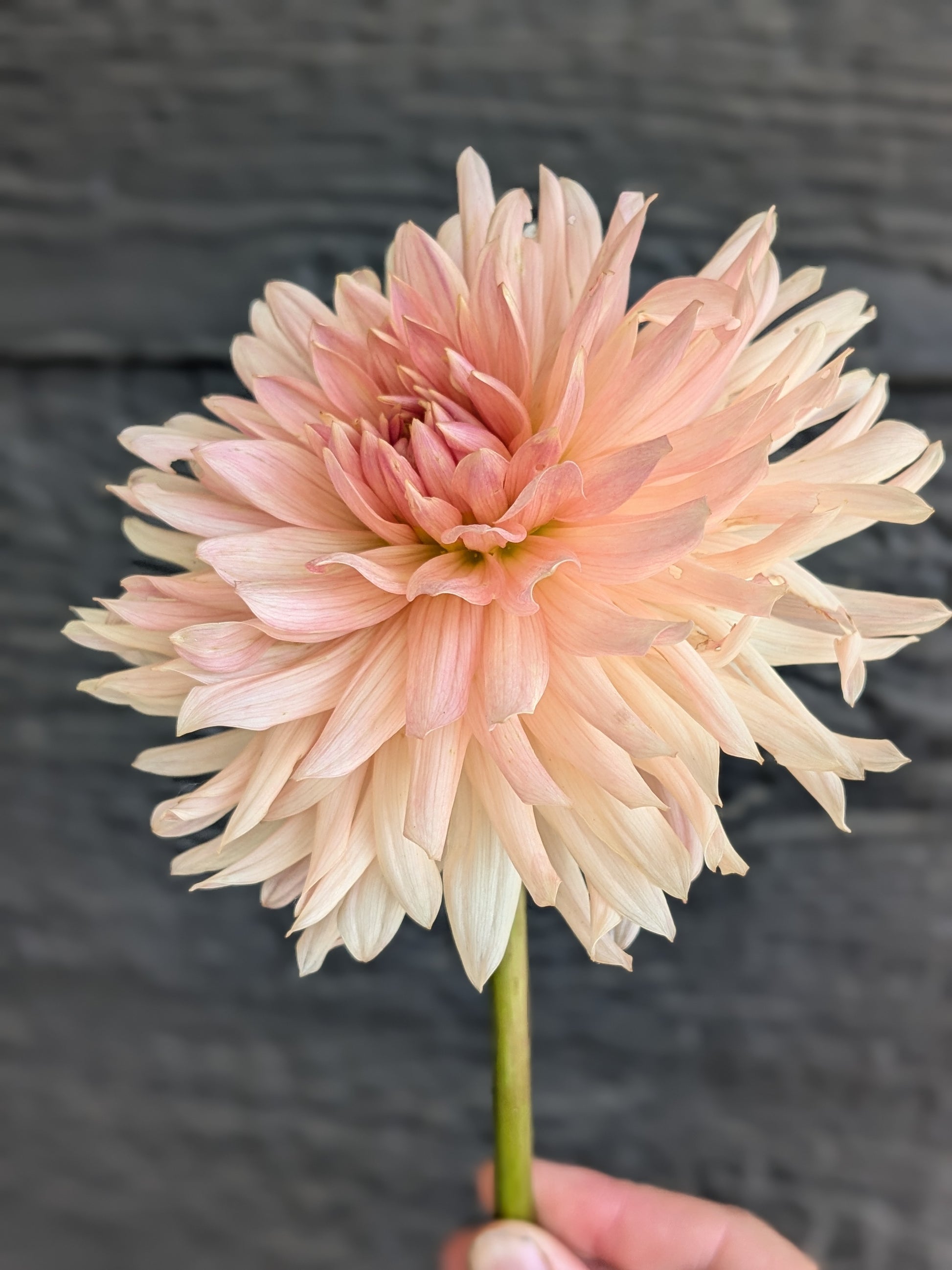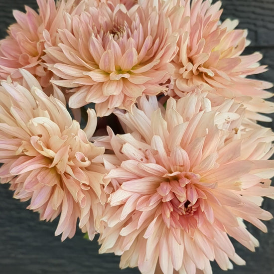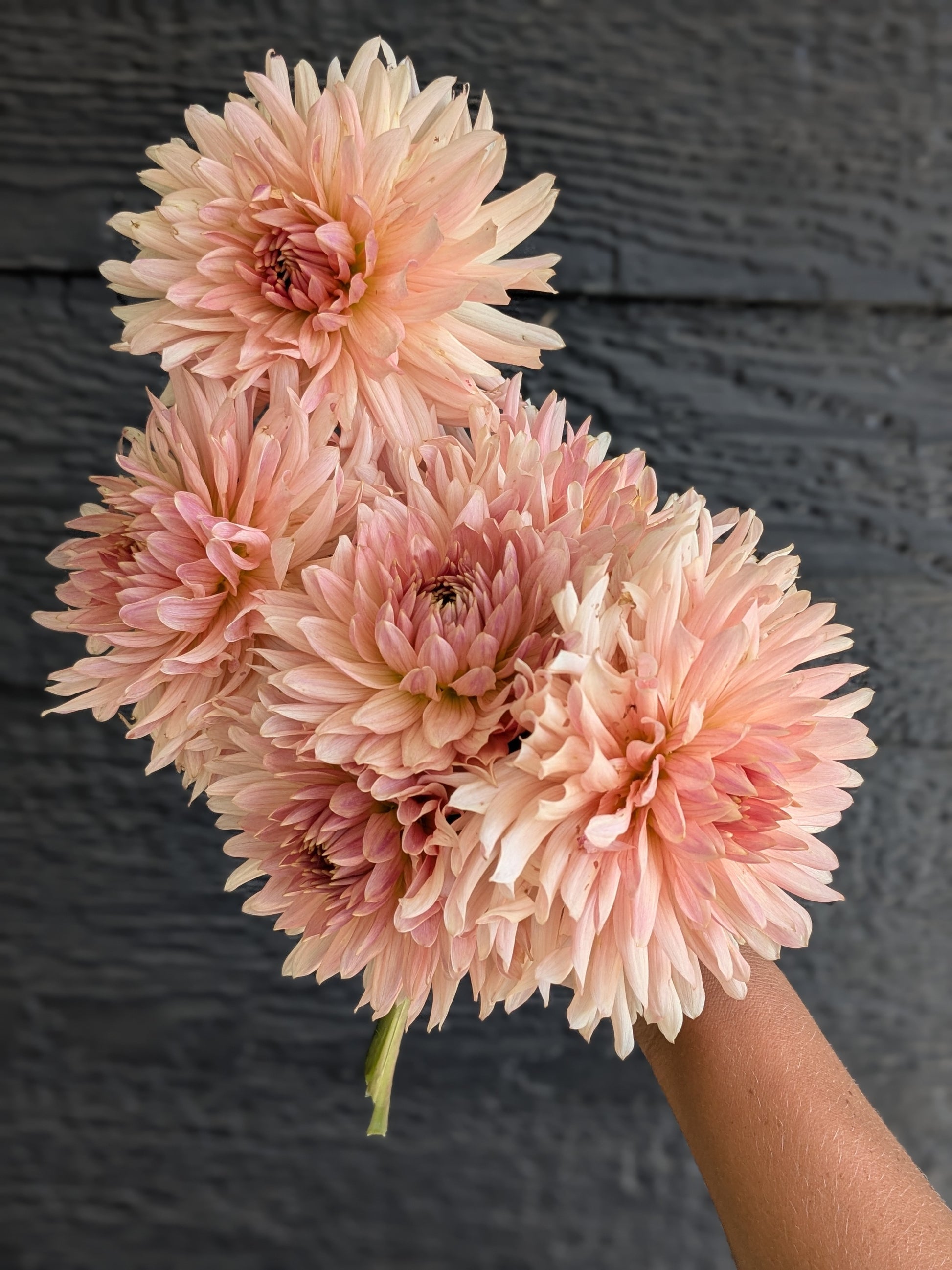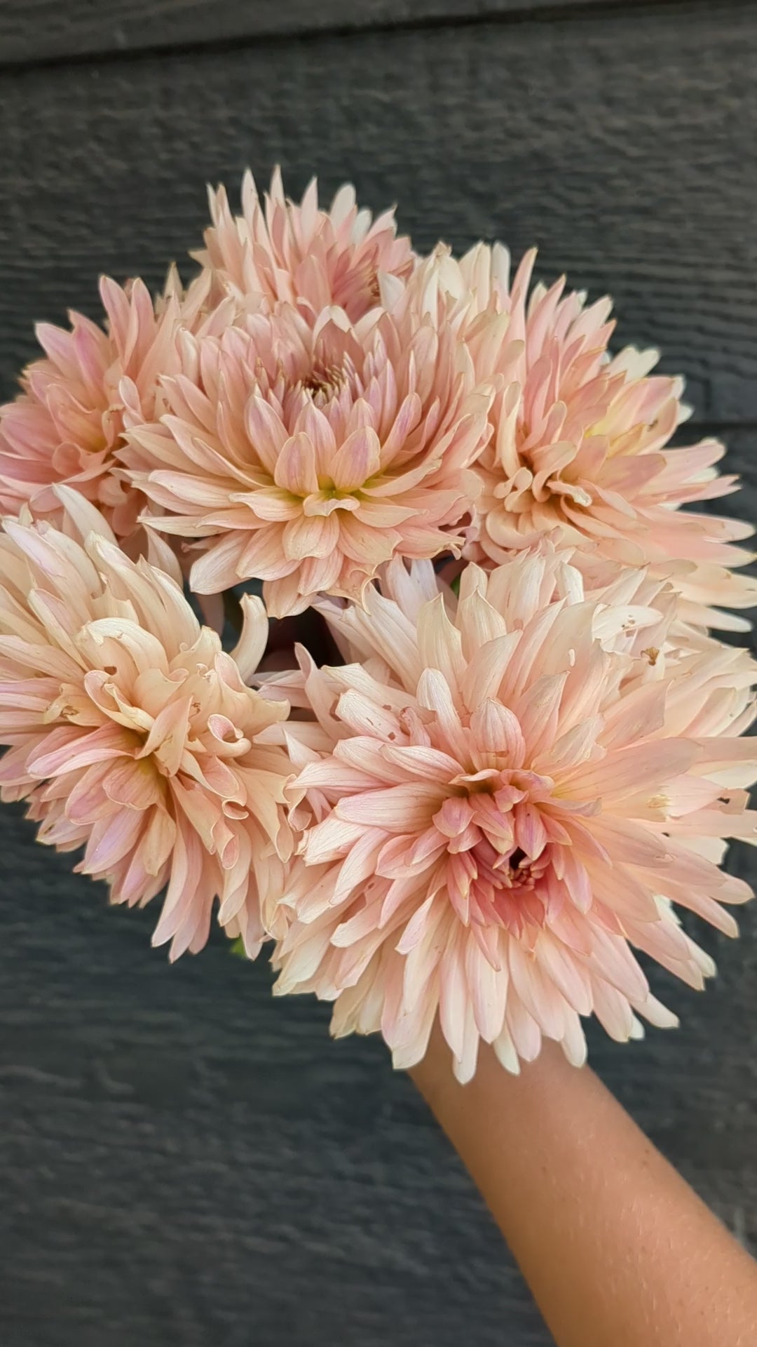 I love love love love love Camano Cloud. It's a semi- cactus and it is the most perfect dusty peach. It doesn't pull pink or orange, just a true peach. It was a workhorse for me in 2025 and I sold so many stems to florists. I think everyone should grow this one. Blooms range from 3.5-5" across. I haven't seen this one sold many places and we are excited to offer it in our sale this year!