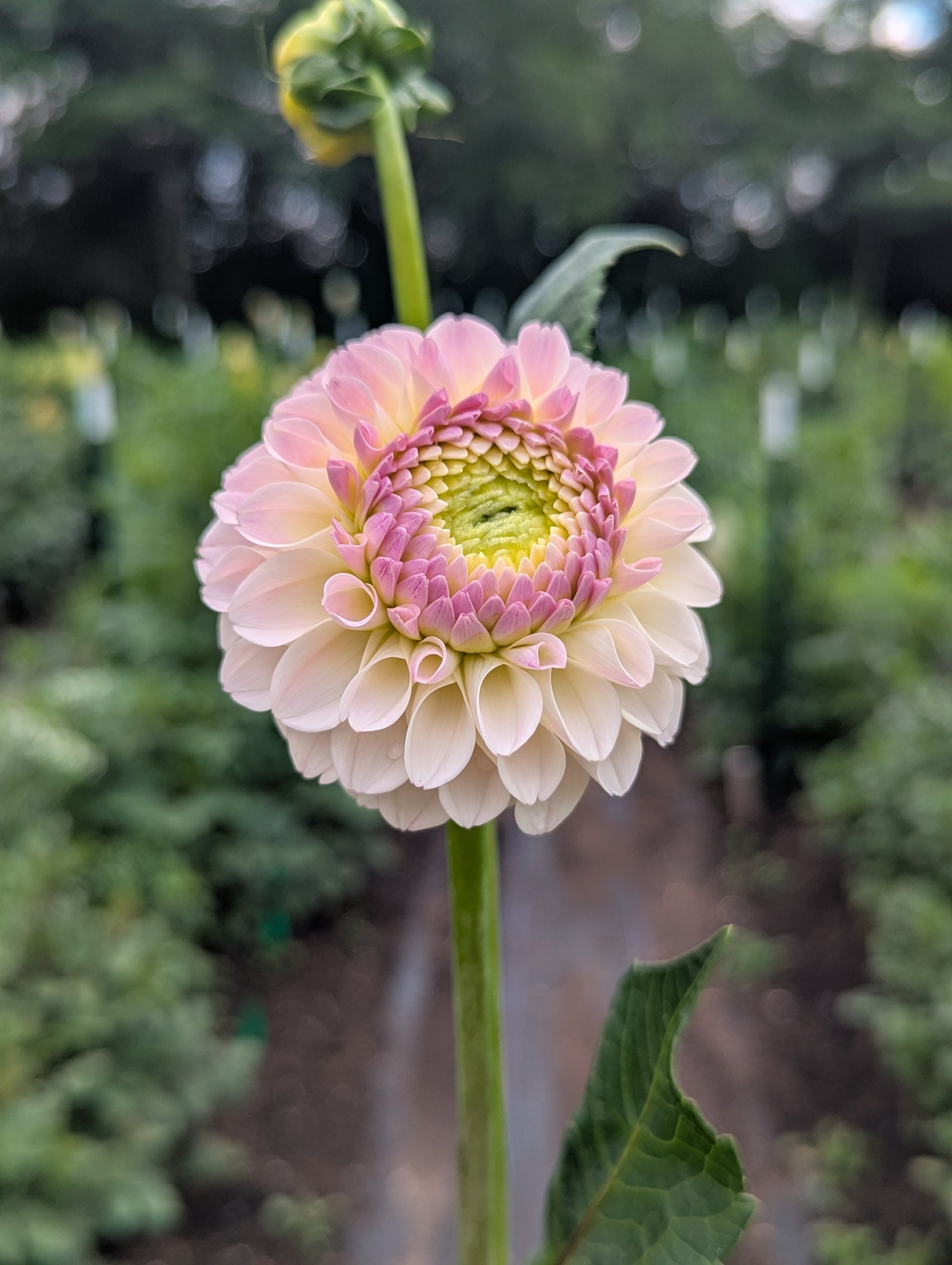 A miniature blush ball dahlia 2-3" across and about 5' tall. This is the perfect small ball blush dahlia! I love using it in my lighter bouquets and florists love it too! The coloring starts darker in the season and lightens to a very light blush by the end of the season