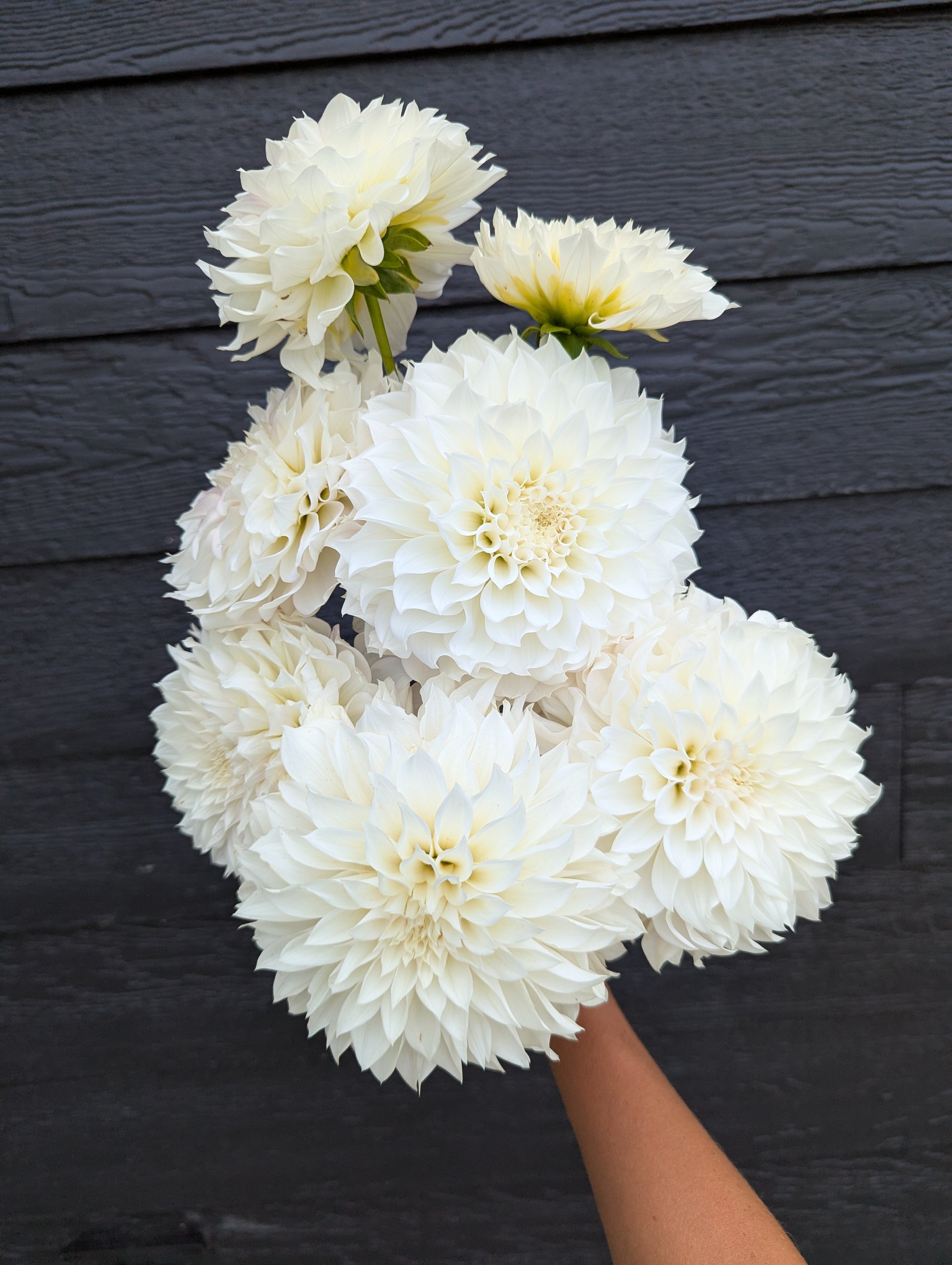 A white formal decorative which sports a pale lavender center in cooler weather. Lots of ruffly petals (I've never seen its center) and fantastic long stems. 5" blooms.