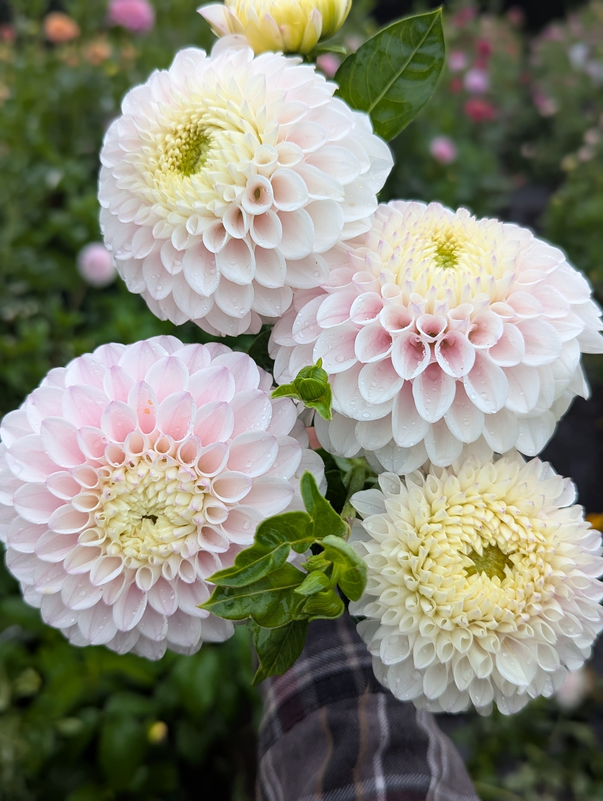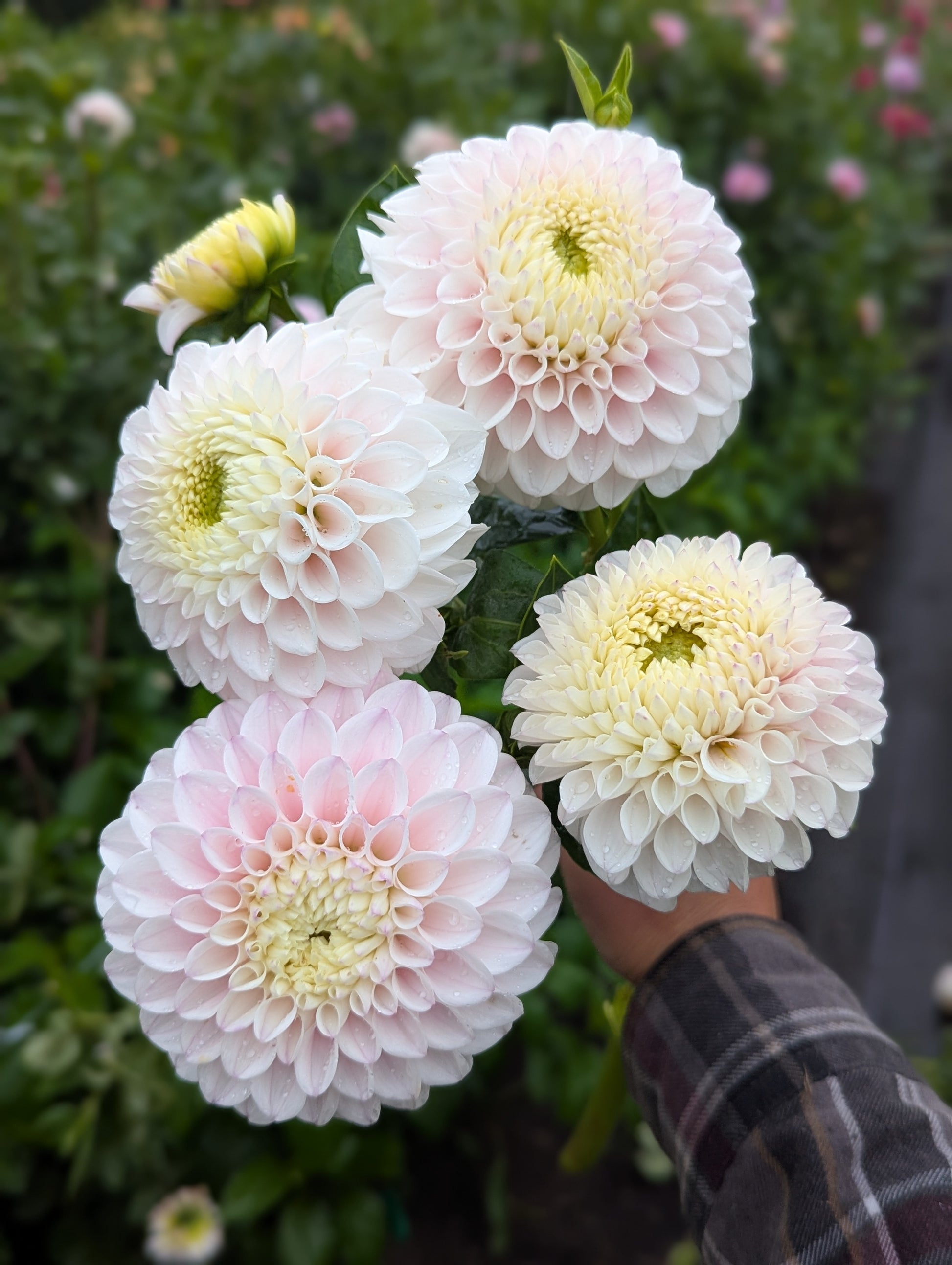 Big blush blooms 4-5" across. The absolute perfect blush. The centers can be kind of wonky, but her delicate coloring and size make her a good variety to have.