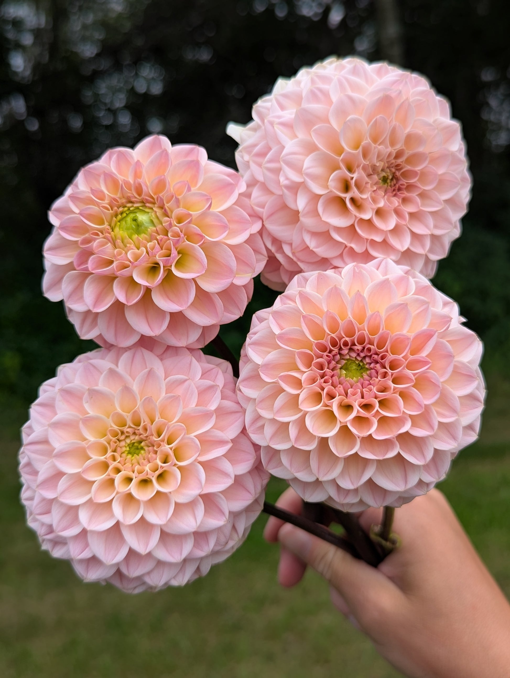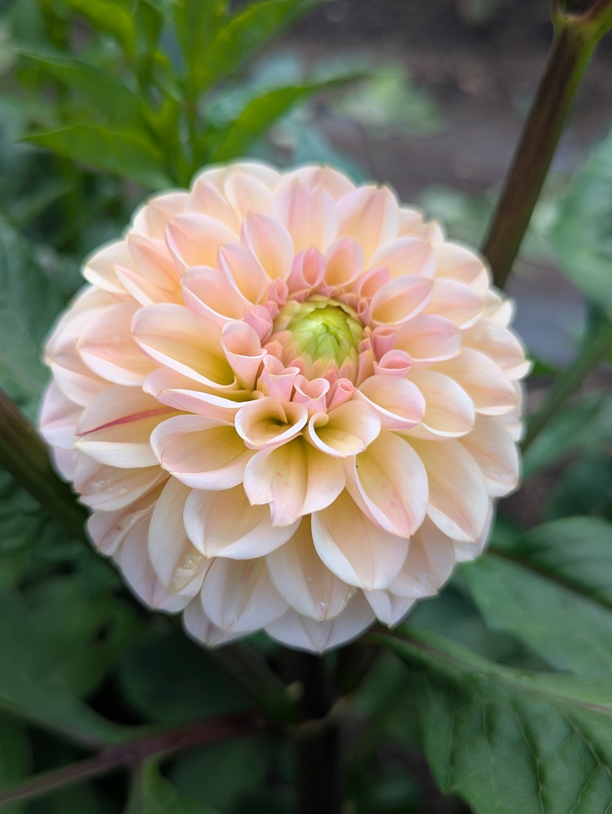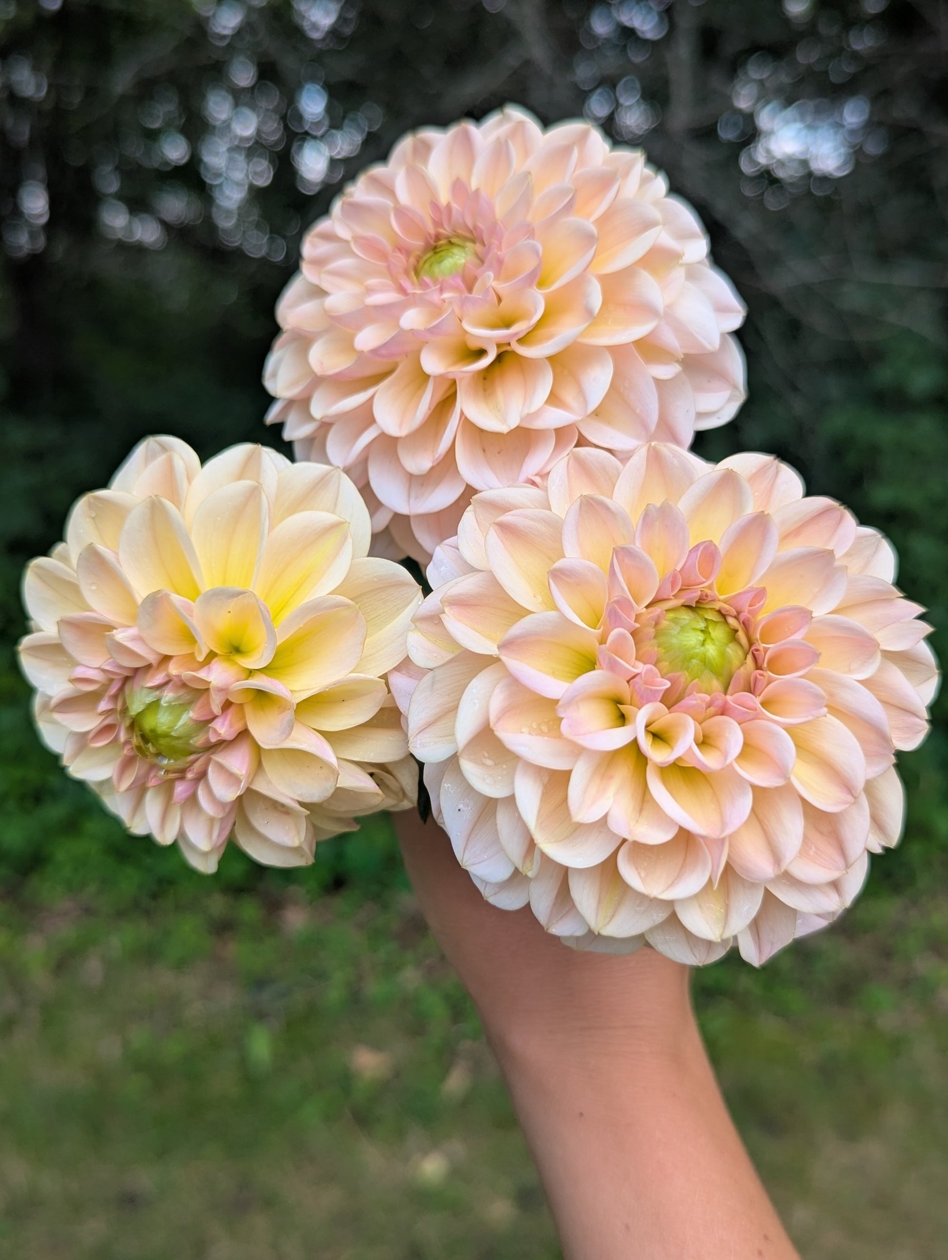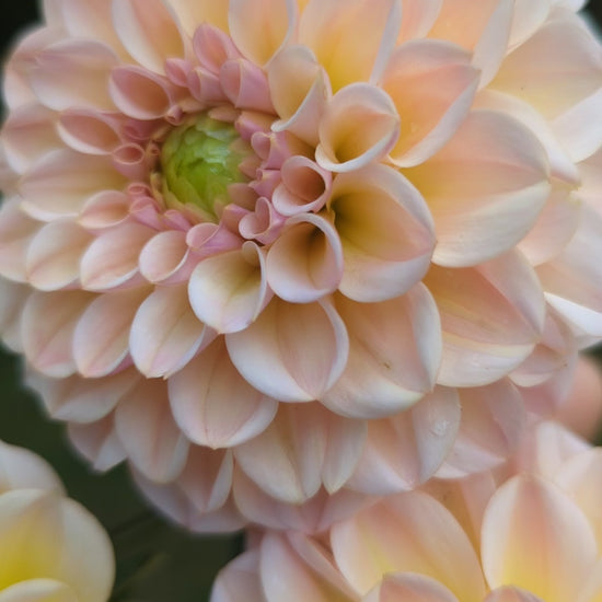 This miniature formal decorative has very pretty champagne coloring ranging from yellow to champagne to blush. Green centers at the start of the season close up at the second half of the season. It elevates any bouquet it's in! I can't wait to grow more next year. Plants are about 3.5' tall and blooms about 3" across.