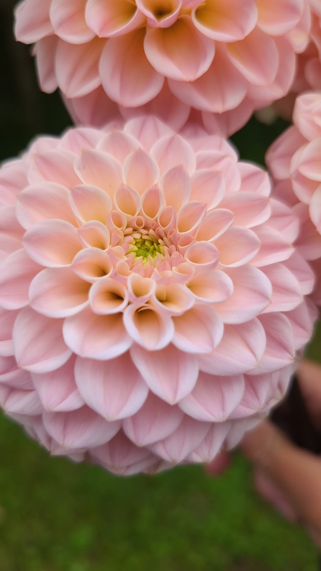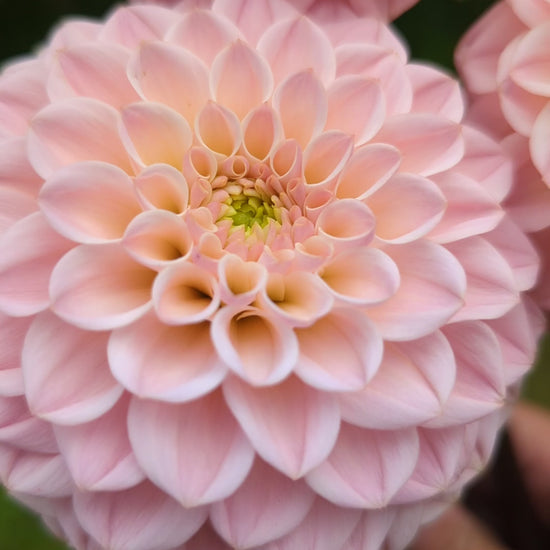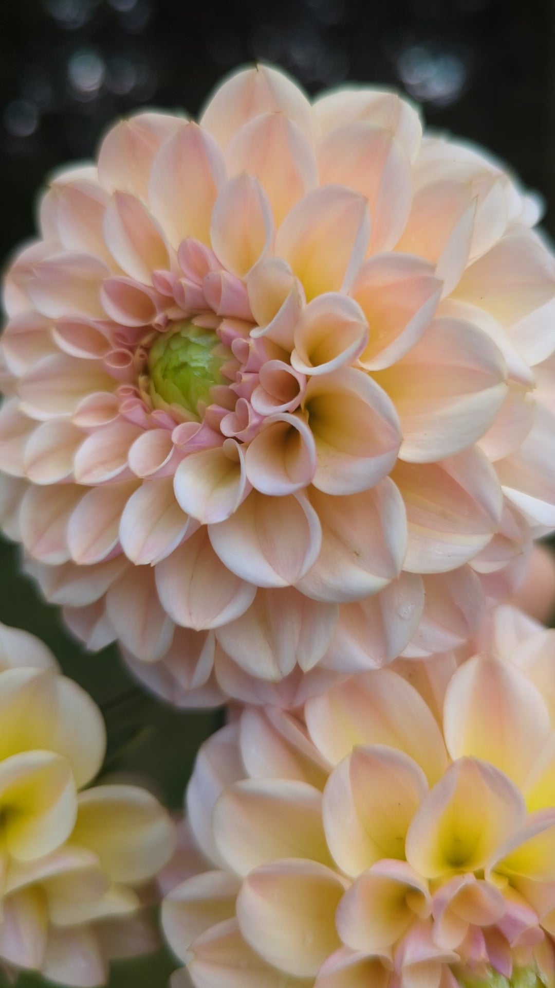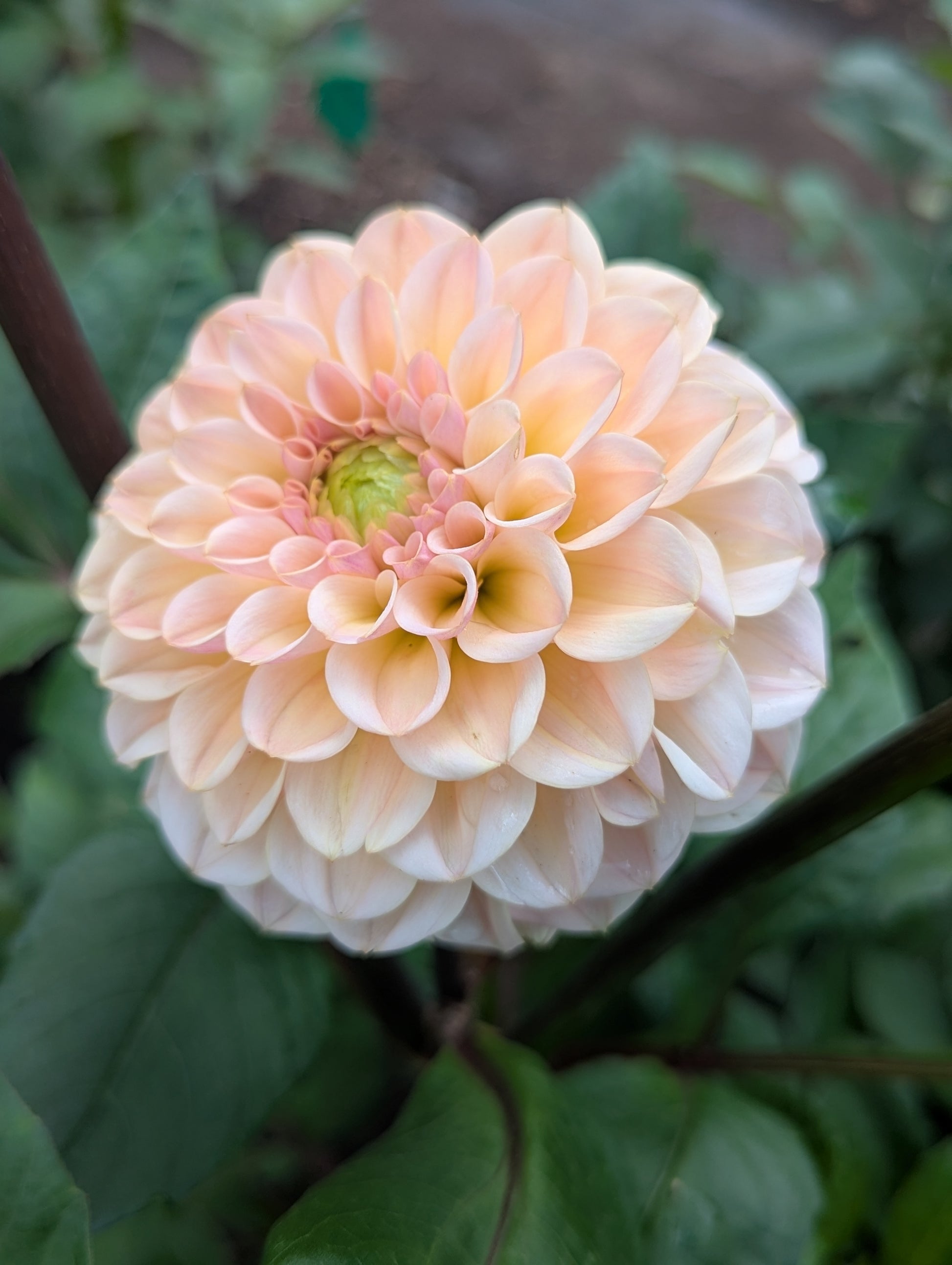 This miniature formal decorative has very pretty champagne coloring ranging from yellow to champagne to blush. Green centers at the start of the season close up at the second half of the season. It elevates any bouquet it's in! I can't wait to grow more next year. Plants are about 3.5' tall and blooms about 3" across.