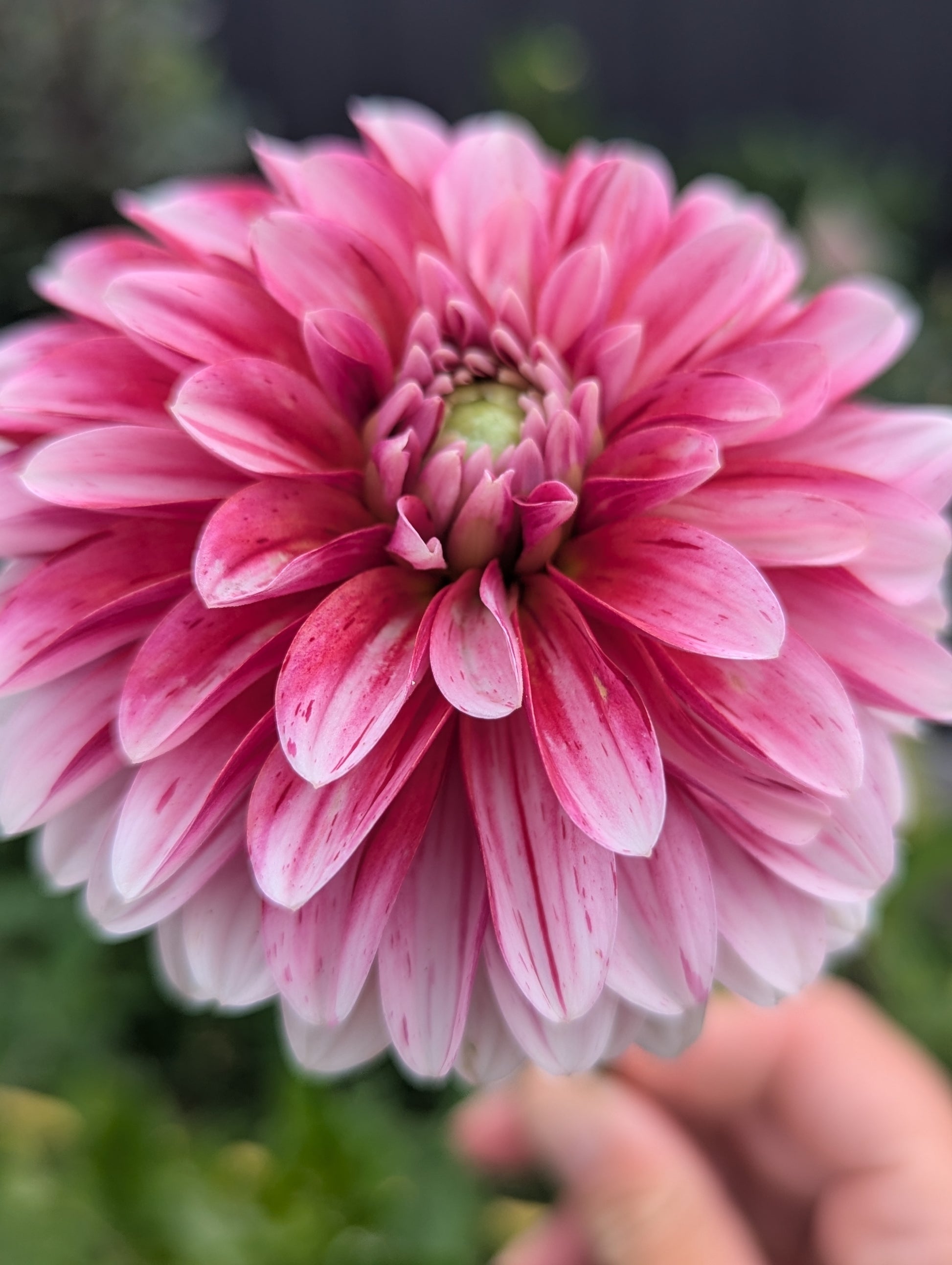 A darling small light pink Dahlia with darker pink streaking. My second dahlia to bloom and she continued to bloom throughout the season. This dahlia loves the camera and photographs so well! I got so many flowers per plant. She's a real work horse. Blooms are about 3"